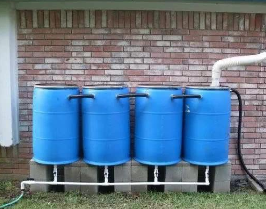 將桶放在最方便使用的落水管下面,底下墊上磚塊或水泥板,抬高50-60cm,使水壓更大,也更方便給澆水壺灌水和噴灌。