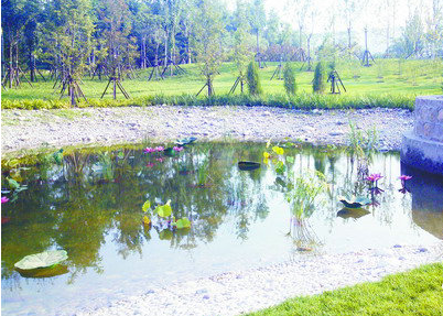 小區沿著排水道建有滲透淺溝,表面植有草皮,供雨水徑流流過時下滲.超過滲透能力的雨水則進入雨水池或人工濕地,作為水景或繼續下滲.